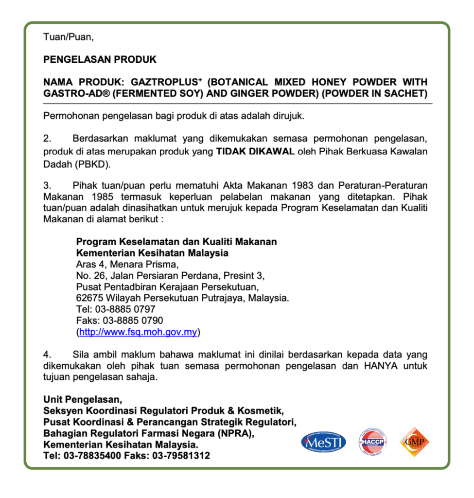 GAZTROPLUS MENDAPAT KELULUSAN KKM DAN SELAMAT UNTUK DIAMALKAN